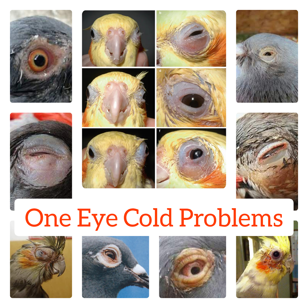 One Eye Cold is one of the most common respiratory infections found in pigeons or birds. It causes severe respiratory disease in birds and usually starts as a mild inflammation in the one eye. A watery or mucous discharge in only one eye is usually the symptom most commonly noticed, but occasionally both eyes will have watery appearances. Eye infections may progress to infections of sinuses and lungs with pneumonia and death.